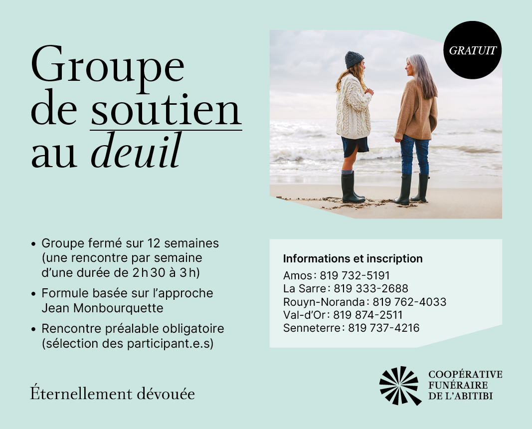 La Coopérative funéraire de l’Abitibi vous invite à joindre un groupe de soutien au deuil, offert gratuitement dans plusieurs villes de la région dès septembre 2025.